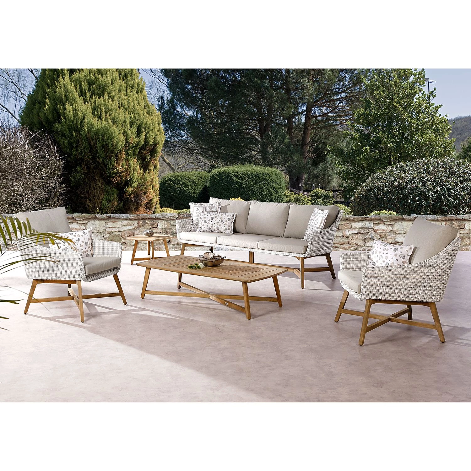 - Structure et plateau de table : teck massif lessivé